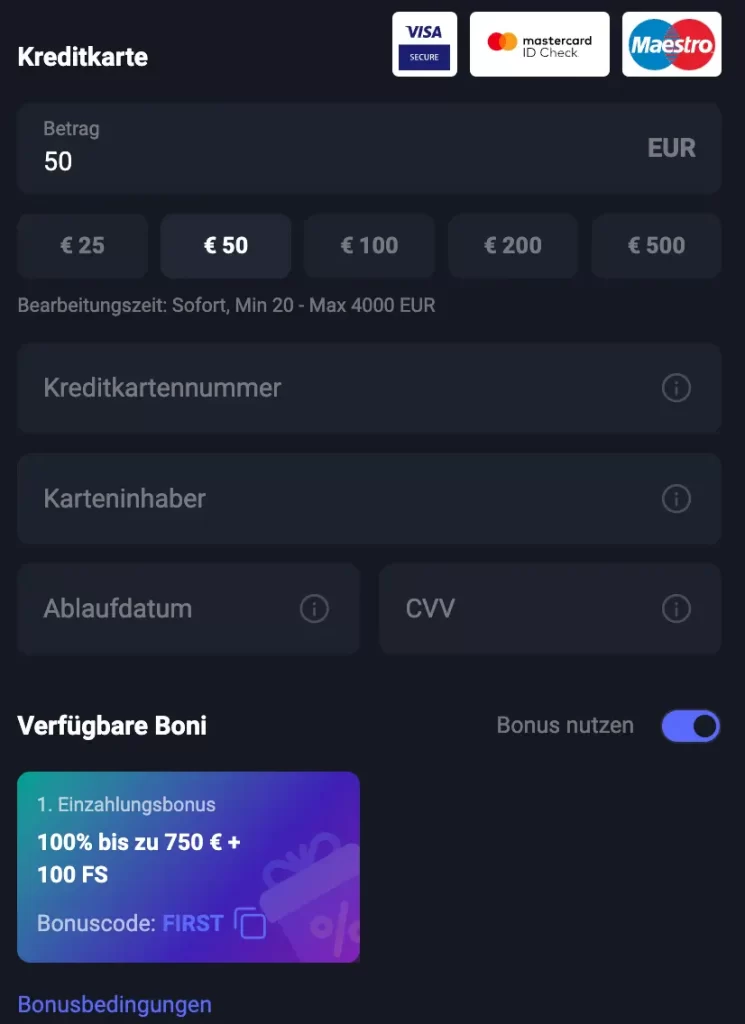 Einzahlung per Kreditkarte: Visa, Mastercard