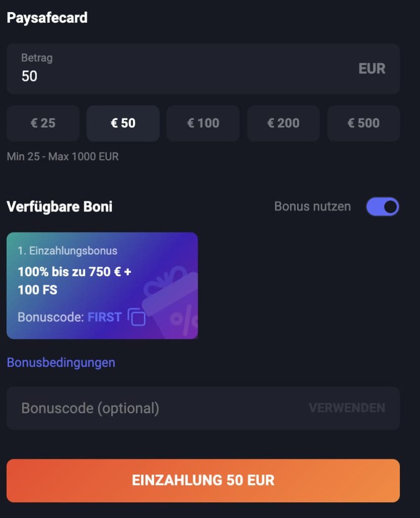 PaySafeCard ist eine Prepaid-Karte, die sichere und anonyme Einzahlungen ermöglicht. Um diese Methode zu verwenden: